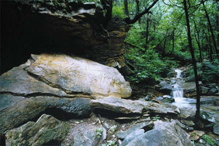 三山之下,自同濟橋起,由北向南有一水道名柳溪,為三山各水流匯集之處。每逢雨后,山洪突發(fā),柳溪即成大河,湯湯不息。而高山之水流入谷中,則成瀑布,聲若洪鐘。大悲寺北谷,三山庵南谷均有此景。而秘魔崖之水瀑為最甚。這便形成一派驚心動魄的水體景觀。昔有“高亭開大,此樂誰與比”詩句贊此。