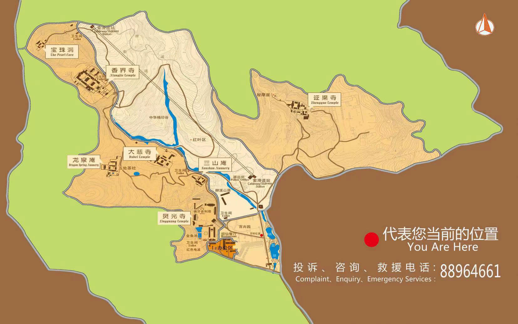 此為八大處一大勝景。霜秋一到,三山之上的黃櫨樹、火炬樹、元寶楓以及柿子樹、核桃樹和山花椒等等,黃時薄山碎,金迎風閃爍,紅時又如二月鮮花處處流丹。有橡樹、青松翠柏,赤橙。