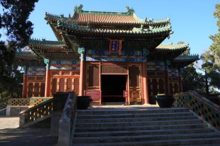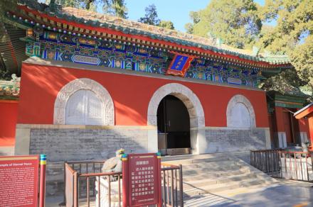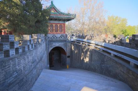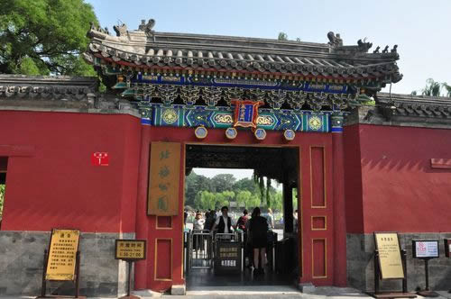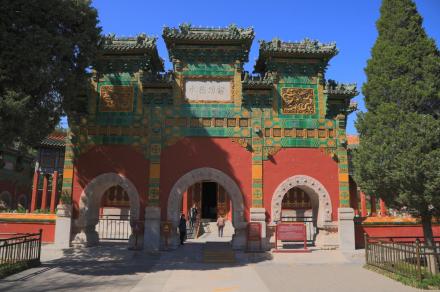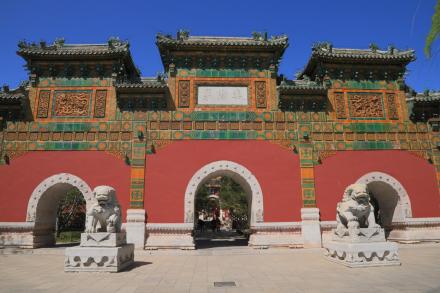智珠殿,半月城位于瓊島東麓山腳下,座西面東與陟山橋相對,建于乾隆十六年(1751年)。智珠殿建在半月城城臺上,紅墻綠瓦,四面有五個(gè)牌樓相對,中軸對稱、布局別致是中國古建筑中比較少見的,殿內(nèi)原供奉文殊菩薩一尊。