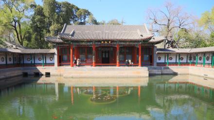 濠濮間位于北海公園內(nèi)東岸小土山北端,是北海公園的一處園中之園。“濠”與“濮”均為中國古水名。據(jù)《莊子·秋水》載,莊子與惠施游于濠梁之上,莊子說:“魚兒出來了,魚兒真快樂。”惠施問:“你不是魚,怎么知魚之樂?”莊子反駁說:“你不是我,怎知我不知魚之樂?”據(jù)此修建小園,園內(nèi)小橋幾近水面,以供帝后觀魚、垂釣。乾隆皇帝曾在此園宴請大臣。