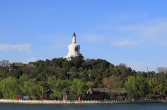 清順治八年(1651年),為民族和睦,清世祖福臨根據(jù)西藏喇嘛惱木汗的請求,在廣寒殿的廢址上建藏式白塔,在塔前建“白塔寺”(正覺殿為山門)。因?yàn)閸u上建起了喇嘛佛塔,山名也改稱為“白塔山”。
