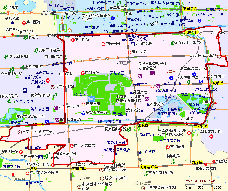 崇文區(qū)是北京市四個(gè)中心城區(qū)之一,坐落在天安門廣場東南側(cè)。東部與朝陽區(qū)搭界,南部與豐臺(tái)區(qū)相交,西部與宣武區(qū)毗鄰,北部與東城區(qū)接壤。平均海拔35米,面積16.46平方公里,轄前門、崇文門外、東花市、天壇、體育館路、龍?zhí)丁⒂蓝ㄩT外7個(gè)街道辦事處,237個(gè)居委會(huì),人口43萬,是北京市最小的一個(gè)市轄區(qū)。該區(qū)已于2010年7月1日撤銷。