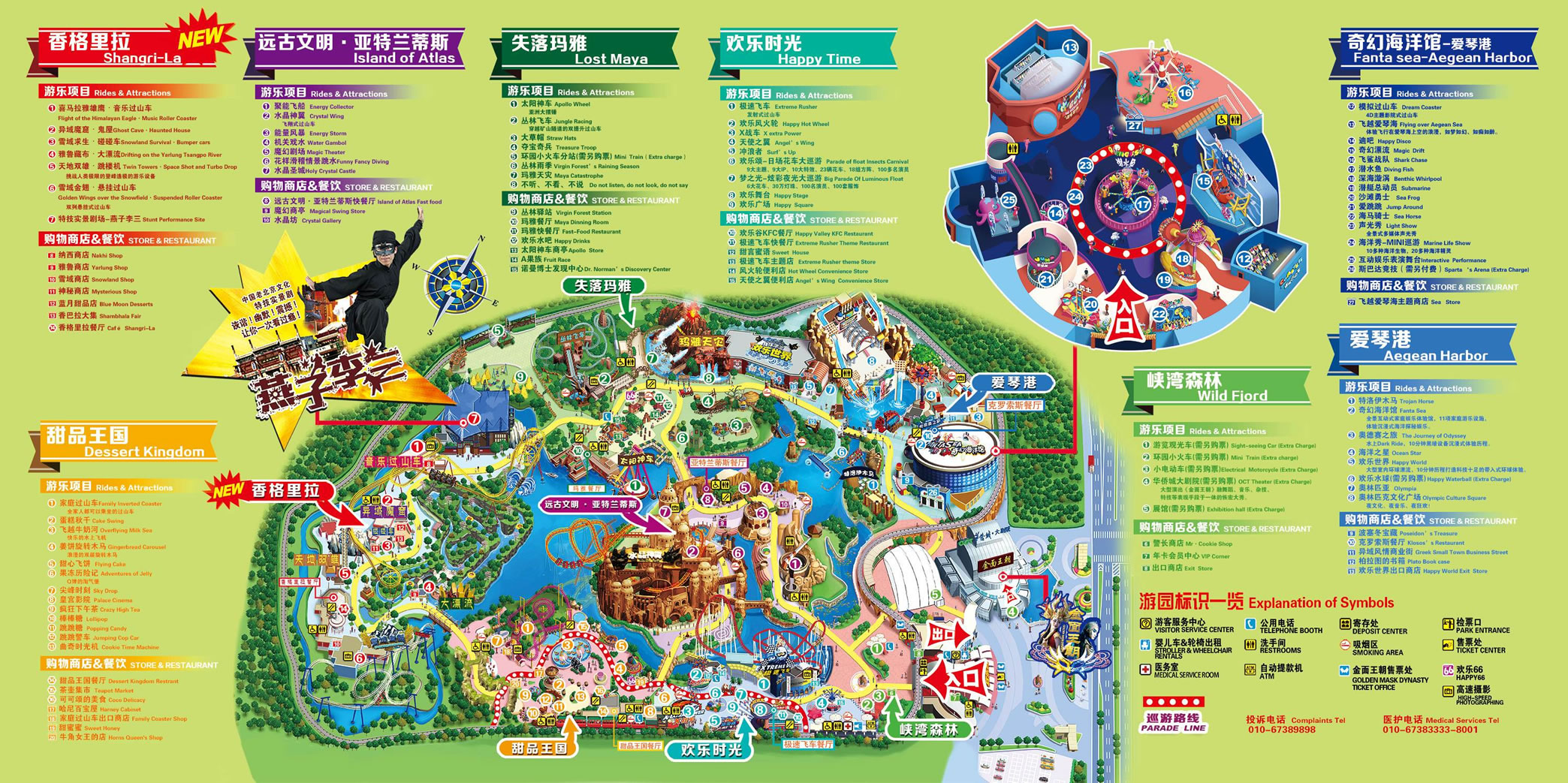 北京歡樂谷由峽灣森林、愛琴港、失落瑪雅、香格里拉、甜品王國、亞特蘭蒂斯、歡樂時光、七大文化主題區(qū)(另外還有位于愛琴港的奇幻海洋館、歡樂世界主題漂流三期項目)組成,通過主題文化包裝及故事演繹,以建筑、雕塑、園林、壁畫、表演、游樂等多種形式向游客展示了地球的生態(tài)環(huán)境與地域文化,園區(qū)內(nèi)精選世界經(jīng)典文明和創(chuàng)意智慧,設(shè)置了50余項主題景觀、10余項主題表演、30多項主題游樂設(shè)施、20余項主題游戲及商業(yè)輔助設(shè)施。30多萬平方米的綠化、8萬平方米的湖面給予歡樂谷良好的生態(tài)環(huán)境;七大主題區(qū)域給予歡樂谷世界各地的人文氣質(zhì);并且具有國際國內(nèi)雙重標準的安全檢測、人性化的服務(wù)配套和智能化的全園信息系統(tǒng)。。