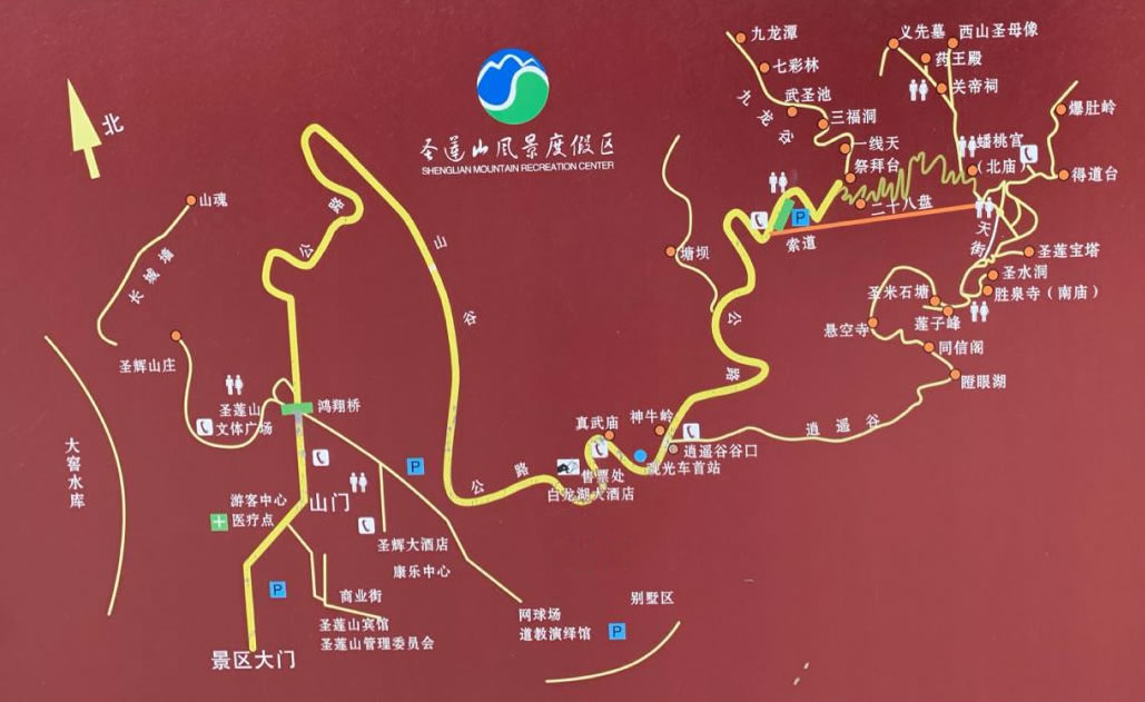 圣蓮山景區(qū)海拔1030米,屬暖溫帶半濕潤(rùn),半干旱大陸性季風(fēng)氣候,四季特征明顯,夏季涼爽怡人,冬季霧鎖迎客松,平均氣溫10℃。7月氣溫最高,平均氣溫24℃。植被垂直分布,分別為溫帶闊葉林、鵝耳櫪萌生叢和荊條灌叢,以九龍谷生態(tài)溝尤為顯著。野生動(dòng)物有哺乳類(lèi)、鳥(niǎo)類(lèi)、爬行類(lèi)和兩棲類(lèi),其中,斑羚、豺、赤狐、紅腳隼、禿鷲、蒼鷹等均為國(guó)家級(jí)保護(hù)動(dòng)物。為了便于游覽獨(dú)特的地質(zhì)遺跡,景區(qū)建成包括綜合服務(wù)區(qū)、典型地質(zhì)遺跡觀賞區(qū)、“圣米”觀賞區(qū)、巖洞洞穴游覽區(qū)、地表巖溶地貌觀賞區(qū)以及人文景觀區(qū)6個(gè)游覽觀賞區(qū)的市級(jí)地質(zhì)公園。主要景觀有山門(mén)、神牛嶺、佛椅山、斑馬石、三碰水、檀香茶舍、祭拜臺(tái)、九龍谷、翠屏峰、二十八盤(pán)道、鷂子翻身、蟠桃宮、九蓮洞、三清殿、古真堂、打坐臺(tái)、八仙洞、天街、蔡義先墓、李娘子宅、長(zhǎng)春洞、關(guān)帝祠、西山圣母、通天洞、夏日觀雪、長(zhǎng)星觀、萬(wàn)仙洞、圣水洞、圣米石塘、望鄉(xiāng)亭、南天門(mén)、百里臥佛、圣蓮寶塔、古碾房、杏林塔院、逍遙谷、天生橋、閻王爺鼻子、晾馬臺(tái)、古松、迎客松等。