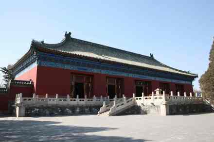 無梁殿:即齋宮正殿,建于明永樂十八年(1420年)。此殿因以磚拱承重,不用梁枋而得名;实圻M出齋宮均在此舉行有關(guān)禮儀,F(xiàn)殿內(nèi)按乾隆時期原貌陳列,橫額“欽若昊天”為乾隆御筆,屏風(fēng)、寶座均為原物。