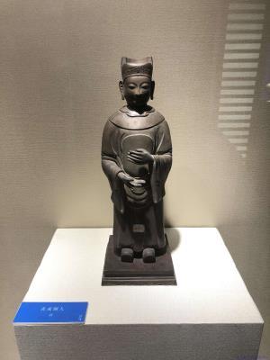 銅質(zhì)。立像戴冠,左手向胸,右手平抬向上,作抱持“齋戒”牌狀。腳下方形底座,以釬插接上方人像。
