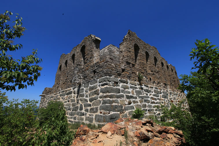 九眼樓長城 九眼樓長城位于四海鎮(zhèn)火焰山頂部。因敵樓每面有9個(gè)箭窗,故名。又因山勢高峻,晴天可望到北京城,故也稱望京樓。為長城重要關(guān)口之一。海拔1141米,F(xiàn)樓內(nèi)有灶炕、居室遺跡,近處有馬場、晾馬場、軍營(營城)遺跡。樓北側(cè)有明代官員徐申于萬歷十三年(公元1585年)巡行到該地書寫的大理石碑一方。 九眼樓為正方雙層建筑,因每邊有九個(gè)了望孔而得名,現(xiàn)存一層,高度為7.8米,每邊為13米,了望孔高1.65米,寬0.5米,內(nèi)有軍士來往巡視寬1.2米的環(huán)行步道。九眼樓下部砌石條,上部用白灰砌青色城磚,構(gòu)建十分堅(jiān)固而壯美。樓下西側(cè)有小平臺,為軍士集中的場地。平臺北側(cè),有磚砌的臺階,沿臺階可達(dá)樓南門。樓頂為磚砌券拱式結(jié)構(gòu),樓內(nèi)寬大,可住兵儲器,向北開兩窗,四面各有一門,門高兩米,闊1.2米,出入極便利。 |