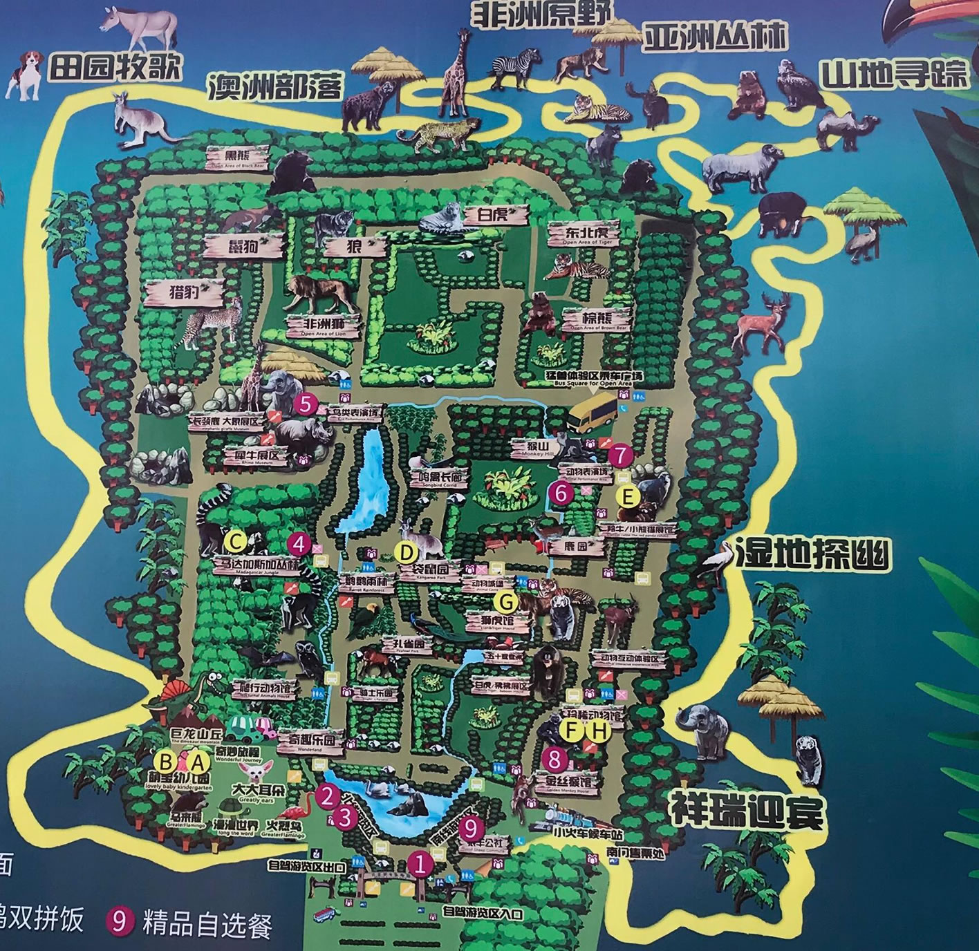 園區(qū)突出一個“野”字,體現(xiàn)一個“愛”字,以“保護(hù)動物、保護(hù)森林”為宗旨,突出了“動物與人、動物與森林” 的回歸自然主題,渲染“人、動物、森林”的氛圍,拉近人與動物的距離。