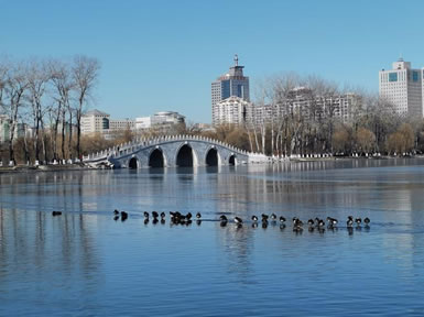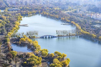 引水湖在公園東北部,有一幽靜湖區(qū),原來(lái)為林木囤養(yǎng)區(qū),植被繁茂。隨著公園環(huán)路的建設(shè),這個(gè)占地9.5公頃,地勢(shì)低洼的林區(qū),在1997、1998年被大規(guī)模回填改造。該景區(qū)的水系是自東湖而來(lái),至釣魚臺(tái)而去。北部地形舒緩開闊,以雪松,銀杏和挺拔的白楊等喬木為主,散布于開闊的草坪,沿公園環(huán)湖路北,配以海棠等春花灌木帶,極具90年代的疏林草地風(fēng)格。
