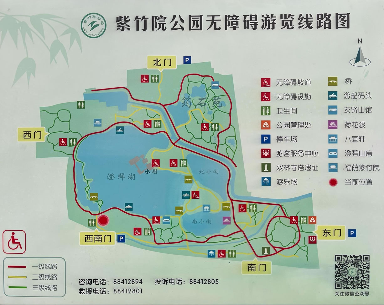 紫竹院公園占地47.35萬平方米,其中水面18.9萬平方米,水面約占三分之一。南長河、雙紫渠穿園而過,形成“三湖兩島一堤”的基本格局,是一座翠涌芳島,篁映碧波,以竹取勝,以竹為景的自然山水園林。分為綠毯詩韻、青蓮島、明月島、筠石苑等景一片蓄水湖,公元三世紀時,這里是高梁河的發(fā)源地,系燕京水源之一。明代萬歷五年(1577年),在湖北岸興建紫竹院廟宇,為萬壽寺的下院。全園占地47.35公頃,其中水面占18.9公頃。園中有大小湖泊三個,兩座小島,五座拱橋把湖、島、岸連在一起,橋、廊、亭、榭,點綴其間,紫竹院公園以竹景取勝。過去傳說觀音菩薩居住在南海紫竹林,這里一建有供奉觀音的寺廟而得名。共栽有10余種竹子,16萬余株,成為一座以水景為主,以竹景取勝,深具江南園林特色的大型公園。 1999年開通的京城到頤和園水上旅游線,這里是必經(jīng)之路。 健身旅游賞景的好地方。