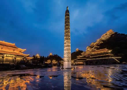 九黎神柱是苗族的象征之柱,采用漢白玉精雕細(xì)刻而成,總高24米,象征一年四季十二個月、二十四節(jié)氣,有圓滿團(tuán)圓之意。神柱上雕刻苗族古歌里崇拜的三十六堂鬼、七十二堂神(三十六天罡、七十二地煞)雕像,這些鬼神都是苗族的保護(hù)神。苗族先民把楓木作為圖騰,由于楓樹木放在室外容易腐爛,九黎神柱采用石材雕刻而成,是雕刻人物最多的少數(shù)民族圖騰柱。是蚩尤黎城第三個被列入大世界基尼斯之最的建筑。