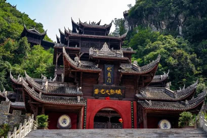 九道門是蚩尤九黎城的標(biāo)志性建筑,是進(jìn)入景區(qū)的主要通道。沿山脊建有3座石門、3座木門、3座磚木結(jié)構(gòu)門,每座牌門建筑錯落有致,造型各異,以九黎部落命名,分別名為畎夷門、于夷門、方夷門、黃夷門、白夷門、赤夷門、玄夷門、風(fēng)夷門、陽夷門。采用金、木、水、火、土天地五行作為用材和風(fēng)水的象征,面朝北方。每一座牌門上都雕刻有苗族民俗文化、歷史故事和民間吉祥的圖騰!熬诺篱T”是世界上唯一的九進(jìn)門庭,已被列入上海大世界基尼斯之最。