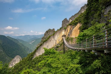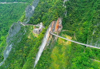 舍身崖位于情人谷尾部,海拔300~600米,因流水侵蝕作用,導(dǎo)致崖壁裂縫薄弱面巖石發(fā)生崩塌形成陡峭壁立的山崖。