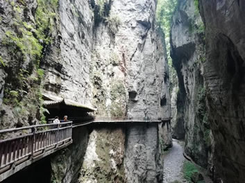 石夾門因兩山壁立如削形成夾縫而得名,是景區(qū)上段最狹窄的地段。兩山對(duì)峙,裂谷靜開,門內(nèi)外景象各異。門內(nèi)峽谷幽深,棧道嵌壁,恍如地心通道;門外四面環(huán)山,別有洞天,宛如世外桃源。