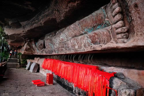 唐代懸空臥佛位于釣魚臺右下側(cè)24米處的山崖上。唐宋時期的釣魚山是著名的石佛道場,曾以精美絕倫的佛教摩崖造像馳名巴渝。相傳懸空臥佛造像系晚唐時期護國寺開山祖師石頭和尚親手鑿造。佛像在懸空的崖壁上鑿成,背北面南,頭西腳東,身長11米,肩寬2.2米,雙領(lǐng)下垂袈裟,頭為高肉髻,兩耳間距1.8米,赤足,雙腳寬1.2米。佛像袒胸露肌,面形豐滿,端莊慈祥,是一尊構(gòu)圖嚴謹、比例勻稱的摩崖造像。