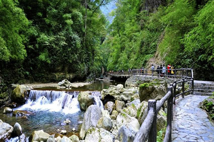 黑猴峽是黑山谷第二個(gè)峽谷,峽谷全長(zhǎng)420米,最窄處僅2米,兩岸險(xiǎn)峰重疊,犬牙交錯(cuò),岸壁傾斜超過(guò)90度,長(zhǎng)年累月難見(jiàn)天日,即使在烈日高照、炎熱難耐的盛夏,這里也是寒氣襲人。因有國(guó)家一級(jí)保護(hù)動(dòng)物黑葉猴經(jīng)常攀跳、嬉戲于此而得名。