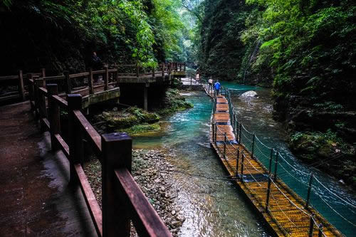 神龍峽是黑山谷最后一個(gè)峽谷。因溝內(nèi)有被視為古夜郎國(guó)唯一貢泉的“神龍泉”而得名。峽谷全長(zhǎng)1200米,峽谷千曲百折,曲徑如走蛇,最窄處只有2米,最寬處不到30米。兩岸群山如黛,層巒疊嶂,怪石嶙峋,峭壁千仞,巖多流紋,飛瀑不斷。