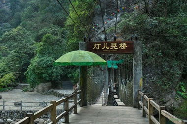 石皇傘位于河谷中央,兩塊30噸重的巨石緊緊地疊在一起像一把巨傘。為崩塌遺跡景觀,巖壁崩塌至谷底后受到谷底山洪沖蝕作用,因上下巖層強(qiáng)度差異,蹦落體下部遭受洪水沖蝕的強(qiáng)度大,小塊松散物被帶走,巖石變細(xì);崩落體上部巖石由于受河水沖蝕作用弱而保持原樣,其形狀很像一把撐開(kāi)的大傘,故名石皇傘。