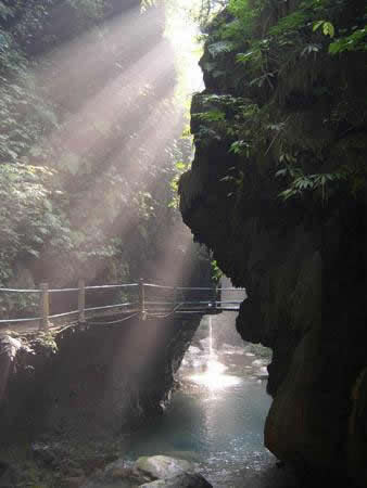 其實藏刀洞乃是一座橫臥于峽中的自生橋。洞口兩側懸崖峭壁、鬼斧神工,它高50余米、寬處10余米、窄處7—8米、長約45米,地質(zhì)構成甚為奇特。該洞是由于億萬年前的地殼運動形成的溶洞,洞內(nèi)長年在二氧化碳流水的作用下,形成了藏刀洞,用手輕輕一摸,上億年時光便從指間悄悄滑過。 |