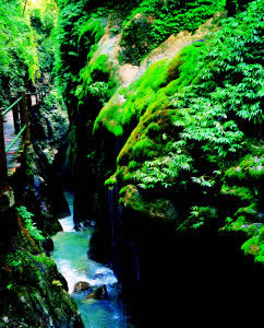 大大小小的泉水順著苔鮮爭相跳躍而下,在陽光的投射下熠熠生輝,讓你想起古人所云:“大珠小珠落玉盤。”人在峽中走,水在峽中飛,時隱時現(xiàn)的陽光,飛泉流瀑濺起的水霧,奇形怪狀的石乳形成一片如夢如幻的世界,這浪漫之旅,讓人留連忘返,不忍離去。
