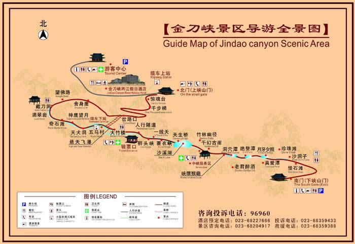 金刀峽地勢雄偉,以峽著險,以林見秀,以巖稱奇,以水顯幽。金刀峽長約10公里,分上下兩段。上段由于喀斯特地質(zhì)作用,地面切割強烈,金刀神功般形成了獨特的峽谷幽壑,石壁如削,兩山岈合,垂直高度超過百米,上有古藤倒掛,下有潺潺流水;下段由于流水侵蝕的作用,有洞穴群提高潭潭相連,飛泉瀑布層層疊疊,古鐘乳、石筍、石柱更是千姿百態(tài),堪稱全國最長的峽谷十里仿古木棧道,讓人驚嘆不已。憑棧探幽,可感悟那蘊藏于大自然山水的天地靈氣。十公里風景線以雄、險、奇、幽著稱,集瀑、泉、洞、峽于一體。有驚魂臺、藏刀洞、懸天飛瀑、天犬洞、神鷹峽、獅頭峽、一線天、沙溪湖、中峽天然浴場、千幻古巖、彌樂佛、心形潭等四十多個景點可供游客探險、攀登和水上游樂,是人們度假避暑、踏青、回歸自然的旅游佳境,被游客譽為“夢中的香格里拉”、“中國第一險峽”。