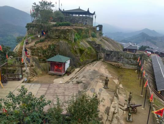 滑石寨位于金帶鎮(zhèn)滑石村3組,是平壩上突兀拔起的一座高260多米的孤峰。孤峰呈紡錘形,四周皆是懸崖峭壁,峰頂平地有6000平方米左右。峰西是一堵傾斜約75度、近10萬平方米的完整石壁,石壁上鑿有一條寬不盈尺的之字形石階,它是通達寨上的惟一路徑。從山下到寨上要走1個多小時路程,其中要經(jīng)過2000多級在石壁上開鑿的石階,山腰到山頂分別有兩道寨門把守。記者在現(xiàn)場看到,山腰一道寨門門楣上清晰刻寫著“未雨,嘉慶二年十月立”字樣。登上寨頂,數(shù)十間木質結構的房瓦痕跡依稀可見,青石砌的寨門和寨堡仍保存完好,四道墻體上都開有射擊孔。整個寨堡耗石約1萬多方,工程浩大,令人稱奇。