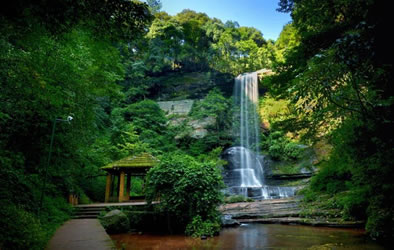 水口寺瀑布高94.18米,寬30米,最大的流量為每秒120多立方米,是四面山第四大高瀑。觀水口寺瀑布可經(jīng)過(guò)棧道到達(dá)瀑布背面平視瀑布,可從“九道拐”走下818步石梯于底端仰望瀑布。坐石觀景,四周奇石嶙峋,入目銀瀑飄飛,腳下流水潺潺,半山古樹(shù)盤(pán)扎。