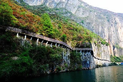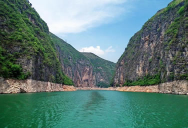 滴翠峽是小三峽的第三峽,從雙龍至涂家壩,全長20千米。主峽區(qū)從滴翠峽口至飛云洞,長15千米,是小三峽中最長、最幽深、最秀麗的一個(gè)峽谷。峽內(nèi)絕壁連綿,群峰競秀,竹木蔥蔥;凌空瀑布,一江碧流,鴛鴦戲水,群猴攀緣,饒有野趣。