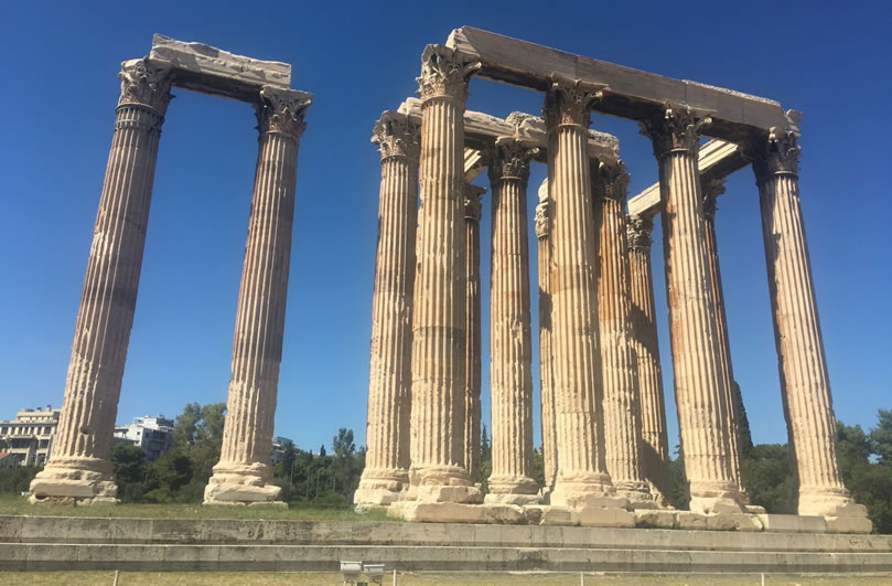 宙斯神廟 宙斯神廟位于希臘雅典衛(wèi)城東南面,是為了祭祀宙斯而建的,也是古希臘最大的神廟。宙斯神廟建于公元前470年,于公元前456年完工,由建筑師Libon設(shè)計,宙斯神像則由雕刻家菲狄亞斯負(fù)責(zé)。直到公元前86年,羅馬指揮官蘇拉(Sulla)攻占雅典,破壞了尚未完成的建筑,將一部分石柱和其他建材拆下來之后,運到羅馬。直到今天,在羅馬市中心的古羅馬廣場遺址上,還能看見它們。宙斯廟尤以象牙和黃金的塑像而聞名于世。 宙斯神廟是伊奧尼亞風(fēng)格的建筑,后來改用了科林斯式石柱風(fēng)格,而且一概使用大理石。整個建筑坐落在一塊205米長,130米寬的地基上,神廟本身長107.75米,寬41米,共有104根科林斯柱。每根石柱高達(dá)17.25米,頂端直徑達(dá)1.3米,約計用大理石1.55萬噸。和眾多的古希臘神廟一樣,宙斯神廟也遭受嚴(yán)重的破壞,104根柱子中僅存13根。宙斯神廟和哈德良拱門隔路相望,宙斯神廟位于路南,而哈德良拱門則位于路北,這兩座建筑都是由距今1900多年前的羅馬帝國國王哈德良時期修建的。我們已經(jīng)無法看到宙斯神廟和哈德良拱門的原始形態(tài),只能通過斷壁殘垣來回憶當(dāng)時的輝煌。