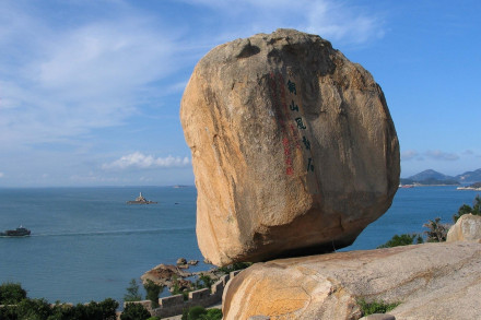 人們常說,到了閩南,不到東山,是一件憾事;而到了東山,不到風(fēng)動石,則更是一大憾事。的確如此。 風(fēng)動巨石聳立在陡崖上,高4.37米,寬4.47米,長4.46米,重約200噸,上尖底圓,狀似仙桃,巍然“擱”在一塊臥地凸起且向海傾斜的磐石上,兩石的接觸面僅為十余平方厘米?耧L(fēng)吹來時,巨石輕輕搖晃不定,人若仰臥盤石上,蹺起雙足蹬推,巨石也搖晃起來,但又不會倒下。人們站在風(fēng)動石下面,有一種驚險的感覺,嘆為天下奇觀,故名“風(fēng)動石”,詩曰:“風(fēng)吹一石萬鈞動”。東山風(fēng)動石因其“奇、險、大” 的特點(diǎn)而被載入《中國地理之最》,譽(yù)為“天下第一奇石”。