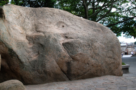 石僧拜塔位于風(fēng)動石左前側(cè)丘嶺之上,為一天然巨石,高約4米,其形酷似身披袈裟的僧人,跪地而揖,面向隔海的東門嶼文峰塔,故名,亦稱“禮僧石”。古人有詩贊曰:“怪石立山門,巋然道貌尊,折腰如合什,低首卻忘言。發(fā)禿寒花補(bǔ),衣緇積蘚皴。九年面壁者,應(yīng)是汝前身! 有人傳言,此一“怪石”原為千百年前的一位高賢志士,因不滿朝政腐敗,天下黑暗,罷官而歸。他誓不與世浮沉,遂遁入空門,四處浪跡云游,最后涉海而入東山絕島,悟得此生路已走盡,嘆西天到底無門,唯有眼前無塵的“大浸”(即大海)是其歸宿,于是朝東面海入定,魂逐長波而去,留下法相幻化為石,即此石僧。