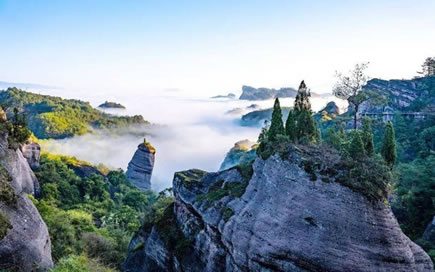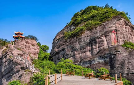 冠豸山屬于丹霞地貌,其自然形態(tài)之美在于山之奇險與幽秀,水之清冽與甘甜。遠望冠豸,山并不高。登上盤旋的山路,走過“蒼玉峽”,來到“半云亭”時,便自然產生“云層覺路嶺千尋”的感覺。丹梯云棧緊與半云亭相連,峭壁之上,開鑿磴道,垂直如梯,右邊是懸崖,巖色赤潤,左邊是絕谷,谷深萬丈。行走在云棧之間,有如行走在古木蒼郁的樹梢之上,行走在半空的云霧之間。