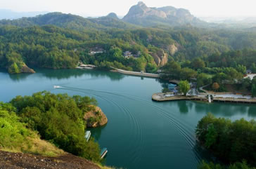共有蜘蛛巖、水上金字塔、鄂魚峰、金鼠巖、九龍獻瑞、佛洞、八仙巖等景點20多處,是冠豸山風景區(qū)又一顆璀璨明珠。 九龍湖內港汊眾多,彎彎曲曲,處處是“水上迷宮”,曲徑通幽,是一個珊瑚狀的湖泊,而主要有四大龍溏坑、飛龍坑、九龍灣坑和碧螺坑。主要景點有: 九龍獻瑞:位于大壩口,九條如巨龍走勢的山脈齊聚于次,而其中一條飛龍最為生動形象,蜿蜒曲伸,猶如從天而降猛龍,正潛翔入海,栩栩如生。 金猴戲犬:大壩側一組丹霞石柱、石壁楊成一幅美妙、畫圖。正中石柱活象一位魁梧壯漢,為九龍湖守護神。在它的腳下是“金猴戲犬”圖,金猴激戰(zhàn)天兵天將,面對一群兇神惡煞的圍攻,騰身一躍,站于“哮天犬”尾巴上搔首弄姿,戲弄敵人。 如意壁:在一塊山崖下方,壁立平整,棱角分明。象一扇洞府山門。(也有人稱它為“無字碑”) 靈蚌含珠:一小山丘形似靈蚌,碩大豐滿,勃勃生機,猶如正在孕育著無數個珠的蚌母。 飛龍顯身:九條獻瑞中,其一起在半腰中突然裸露出100余米長龍身。猶如正在它的敵人酣斗中突然顯出原形,威風凜凜震懾對方。這是一道“丹霞山脊”也稱“石梁”,如攀登這段石梁比黃山“鯽魚背”更險更奇。