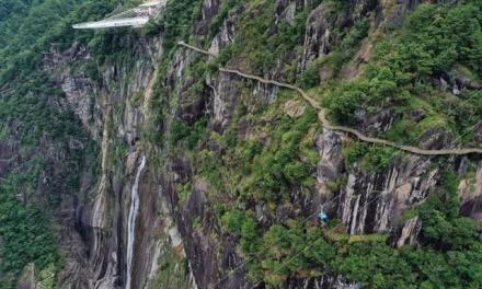心形懸崖棧道位于岱仙瀑布兩側,從遠處看,兩邊的棧道整體呈一個心形,蜿蜒盤桓在崖壁上,心形棧道全程3000米,高差314米,是國內(nèi)難得一見的心形立體環(huán)瀑棧道。