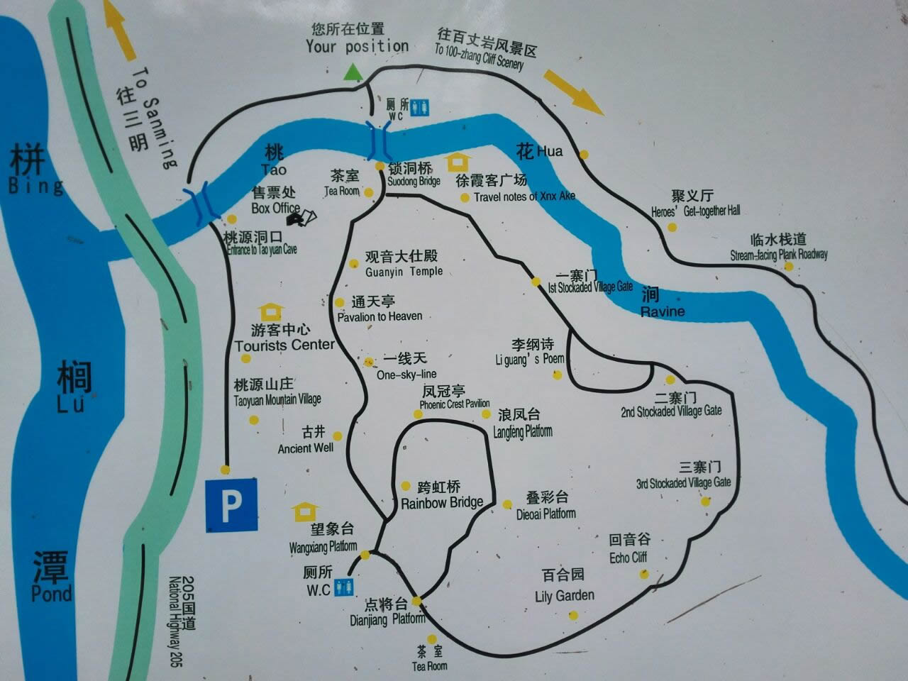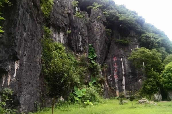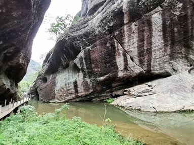 特殊地貌形成兩邊懸崖對峙,這條小澗叫桃花澗,從景區(qū)深處流出,我們的游路也將沿著高山峽谷的縫隙向內(nèi)延伸。桃源洞本沒有“洞”,無論是步行,還是泛舟游覽,都給人一種洞口的感覺右壁的懸崖高達(dá)120米,“桃源洞口”四個大字刻在36米高處,是明萬歷年間,辭官回永安的名士陳源湛于1605年所題,每字兩米見方。