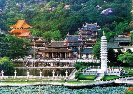 南普陀寺,位于廈門市思明區(qū),始建于唐末五代,初稱泗洲院。北宋僧文翠改建稱無盡巖。元廢。明初復(fù)建,更名普照寺。明末詩僧覺光和尚遷建于山前,殿堂院舍齊備,住僧常達(dá)百余眾,清初又廢于兵禍。清康熙二十二年(1684年),靖海候施瑯收復(fù)臺(tái)灣后駐鎮(zhèn)廈門,捐資修復(fù)寺院舊觀,又增建大悲閣奉觀音菩薩,并以之與浙江普陀山觀音道場(chǎng)相類比,更名為南普陀寺,此后數(shù)百年來,經(jīng)歷代主持景峰、省己、喜參諸和尚多次重修擴(kuò)建,至民國初年,已構(gòu)成三殿七堂俱全的禪寺格局。