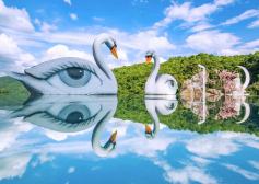 “鏡”與 “凈”的結(jié)合,置身其中,似真似幻。一片碩大的鏡面倒影著天空與山水,與周邊景點相輔相成。