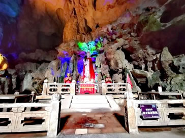 五更天: 前面“天際”出現(xiàn)魚肚白,邊上還有雄雞報曉石,接著,右前方洞頂閃爍著一顆啟明星。往前走,啟明星變成了半個月亮。在空氣濕度大、風小、洞口外有陽光的時候,半月旁還會出現(xiàn)一輪像彩虹一般的“佛光”。 |