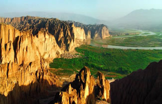 第一次看到黃河石林,便被它那氣象萬千、雄渾壯觀的景象所震撼。黃河石林與國內(nèi)其它知名景區(qū)相比,以古、奇、雄、險、野、幽見長,充分體現(xiàn)了粗獷、雄渾、樸拙、厚重的西部特色,使游客在回歸自然、領(lǐng)略奇異風(fēng)光的同時,陶冶性情,修養(yǎng)身心。徜徉于黃河石林景區(qū),但見長河抱日,峨峰接云,石林聳奇,危崖橫斷,河映崇山,曲流回旋,平疇十里,小村安臥,老屋舊椽,新灘故道,濃蔭鋪地,綠蔽河灣,繁棗滿枝,瓜果溢香,水車唱晚,浪遏皮筏,真乃世外桃源。若沒天橋古道拾級登上南山之巔,則峰林、曲流、綠洲、戈壁盡收眼底,讓人心曠神怡。而滄桑之變中不曾嬗變的原始力量,峽谷間透出的窮靈,陽光里蕩溢的繁麗,又教人于感悟時慧眼頓開。至于觀音崖的兇險,老龍溝的深邃,盤龍洞的神奇,清涼寺的幽寂,還有環(huán)村十溝的撲朔迷離和峽谷內(nèi)景象萬千、古韻猶存的石林峰柱的磅礴氣勢,以及整個34平方公里景區(qū)內(nèi),山的夢幻、河的靈秀,綠洲的靜謚,戈壁的逍遙,不僅令人在沉思遐想中忘卻煩憂,超脫塵俗,更能引人向上,催人奮進(jìn)。