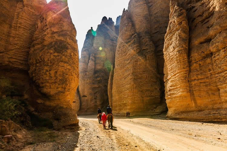 這里的石柱石筍大多高達(dá)八十至一百米之間,最高達(dá)二百多米,均由橘黃色砂礫巖構(gòu)成,鬼斧神工,猶如雕塑大師之夢幻杰作。我們左行至飲馬溝入口,換乘當(dāng)?shù)剞r(nóng)民裝扮得極富民俗風(fēng)情的驢車前行。進(jìn)入峽谷,兩邊布滿了巨大的石筍、石人、石鐘、石崖、石窟,峰回路轉(zhuǎn),步移景變,人們將石景命名為:大象吸水、千帆競發(fā)、伴侶駝、“黃河母親”等等,其形神兼?zhèn),栩栩如生?/p>