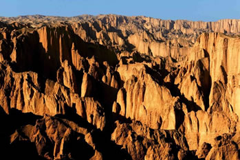 石林則依著黃河的彎轉(zhuǎn),藐著黃河的水流,這個場面保持著一種驚心動魄的興奮,一看就是飛逝而去的千萬年啊,千萬年。老龍灣像一條長長的、波光粼粼的跑道,黃河拍打著細(xì)浪,從聳立的石林中,陡峭的巖石旁流過去,固執(zhí)地向干涸遙遠(yuǎn)的北方挺進(jìn)。風(fēng)吹過,水涮過,千萬年的歲月,靈動和冥想,一路歌舞狂歡。突然一剎那就是永恒。停在那里回轉(zhuǎn)的頭型,飄飛的發(fā)絲,閃逸的裙裾一下子被動結(jié)了,面目間的笑意還沒有來及抹去。假如有一天,您也來到石林,是否會為這一片晴朗而遼闊的天空下毫無造作、天然凝就的靈魂而感動和震撼?大自然的神筆飛揚,你縱然放開想象,馳騁神思。望尖銳或圓錐狀的山峰,基部相連的簇狀,是石林發(fā)育地貌形態(tài)。只要能夠聯(lián)想到的物象,毫無例外活生生矗立在你的眼前,仰觀景慕,活靈神現(xiàn);你沒有想到的也一幕幕向你襲來,目不暇接。山峰如聚,峰嶺沸騰了一般,黃河石林以它非石非巖的特質(zhì),在這塊土地上托起一個立體的神話。雅丹、丹霞、峰林為一體的地貌奇觀寫意了恢弘的場景,刀鋒擁擠,千軍涌動,萬馬奔騰,這儼如一個拼殺的戰(zhàn)場,風(fēng)行走其間鼓動著金屬碰撞的鏗鏘,它不再是一個夸張的舞臺,場面不再是一個宏大的舞池。穿越石林,我們不自主地感知黃土高原的陽剛的軀身,緘默的神態(tài),堅毅的面容,它在風(fēng)雨中矗立,日復(fù)一日,從不愿放棄對大地的眷戀,對太陽的向往。