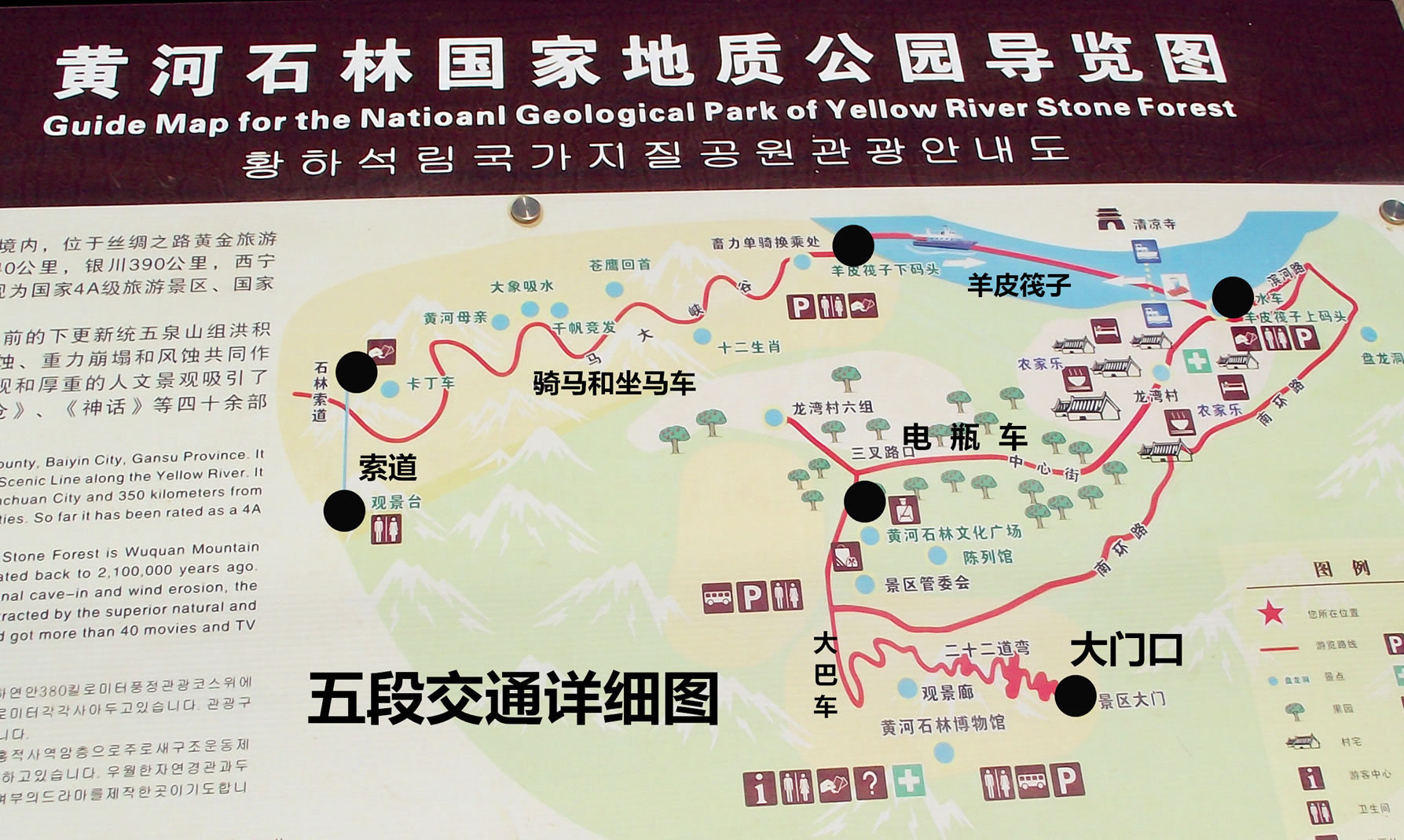 園內(nèi)包括飲馬溝(含老龍溝、豹子溝)、蟠龍洞——觀音崖、地灣三個主要景區(qū)。是一座集地貌地質(zhì)、地質(zhì)構(gòu)造、自然景觀和人文歷史于一體的綜合型地質(zhì)公園,它巧妙的將古石林群、黃河、沙漠、綠洲、戈壁、農(nóng)莊結(jié)合在一起,完美的呈現(xiàn)了一派世外桃源的景觀。景區(qū)核心景觀——古石林群形成于210萬年前的積砂礫巖層,由于新構(gòu)造運動,雨洪侵蝕及重力崩塌,形成許多高80-200米的峭壁、巖柱組成的峰林和峰叢。十里長峽,如同畫廊。奇峰絕壁,崖壑裂隙,千姿百態(tài),神妙無窮;蛲ねび窳ⅲ鼓刃沱;或粗獷古樸,壯觀恢宏。 景區(qū)集中展現(xiàn)了純天然、大構(gòu)造、多層次的地質(zhì)構(gòu)造,浸透著雄、奇、險、古、野、幽的原始風(fēng)韻,充分體現(xiàn)了粗獷、雄渾、樸拙、厚重的西部特色,令人嘆為觀止,留連忘返。