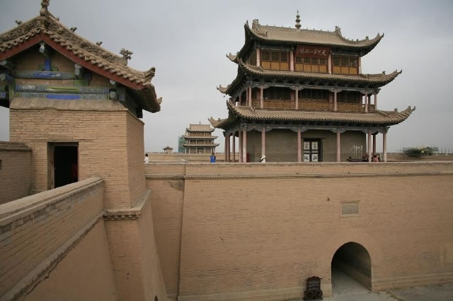 內(nèi)城四角有角樓,也叫“戍樓”,形如碉堡,是守城士兵值勤放哨的地方。南北城墻建有敵樓,是放置兵器的地方。站在這里回望,“光化樓”、“柔遠樓”及“嘉峪關(guān)樓”三座高大建筑,同在一條中軸線上。這種“過洞式城門”及高臺樓閣建筑形式,是中國幾千年建筑歷史及建筑形式的延續(xù)發(fā)展。
