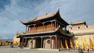 建于明正德元年(1506年),由時任肅州兵備副憲李端澄主持修建!肮饣瘶恰睘槿龑尤苄巾斒浇Y(jié)構(gòu),樓高17米。精雕細刻,五彩裝成。樓閣第一層為磚木結(jié)構(gòu),第二、三層是木結(jié)構(gòu)榫卯咬合而成,雖經(jīng)歷了近五百年的風風雨雨及地震等自然災害,仍巍然屹立于關(guān)城之上。