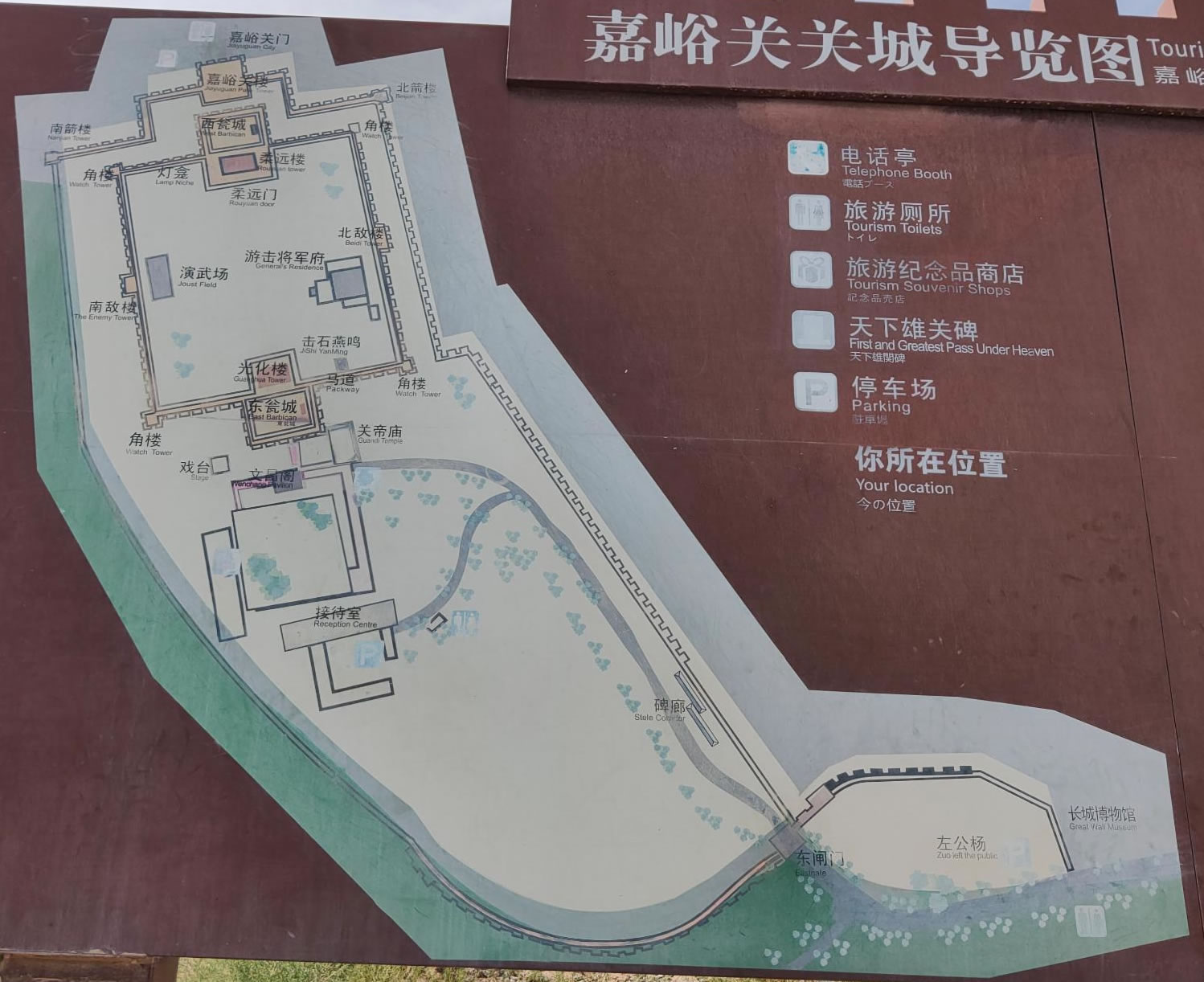 關(guān)城周長733米。關(guān)城正中有一官井,舊有亭,今已廢。西門外套筑一道凸形城墻,構(gòu)成一個羅城,這就是外城。外城比內(nèi)城高2.7米。外城正中大門額刻“嘉峪關(guān)”三個大字。門頂原有城樓,與東西二樓形制相同,三樓東西成一線。民國十三年(1924年)城樓被毀。西面羅城磚砌,東、南、北有土筑圍墻,連接長城。城外有城,迭門重城,成并守之勢。東甕城外有文昌閣、關(guān)帝廟、戲樓,城內(nèi)靠北有游擊衙門府一座,都是清代建筑。新中國成立后,關(guān)城曾多次維修加固,保存完好。