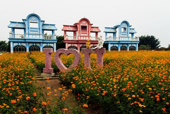 三座粉、藍(lán)相間的巨型迪斯尼風(fēng)格門樓,一片橙色的仙女花在陽(yáng)光恬靜地流敞著。七個(gè)巨型的氣球“串”綻放繽紛色彩,邊上還圍著精美的花柱。香格里拉,正如其名,有著一種永恒、和平、寧?kù)o的 “世外桃源”。