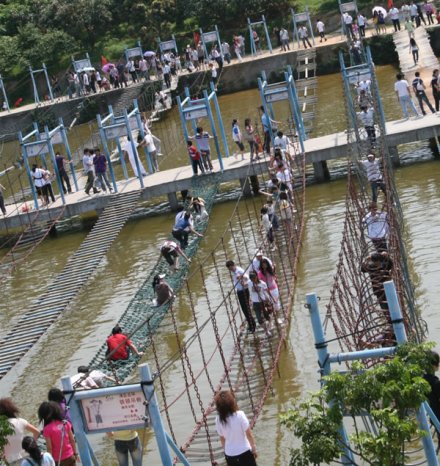 拓展訓(xùn)練基地占地面積10余畝,是深圳市青少年生存能力素質(zhì)教育基地,分為水上游樂區(qū)、高空拓展區(qū)與兒童游樂區(qū)。特別是水上游樂區(qū)涵蓋了霹靂滾桶、魔鬼車輪、木樁功夫橋和鐵鎖吊橋等有趣刺激拓展運(yùn)動項(xiàng)目。您既可以在青山綠水中盡情呼吸新鮮空氣,又可以在動感十足的拓展項(xiàng)目中挑戰(zhàn)自我,體驗(yàn)這一風(fēng)靡全球的拓展運(yùn)動帶給你的無限快樂。項(xiàng)目網(wǎng)羅: 霹靂滾桶、魔鬼車輪、秋千橋 、連環(huán)獨(dú)木橋 、木樁功夫橋、 空中獨(dú)木橋、園木云梯橋、鐵鎖晃橋、長板坡 、 云梯橋 、鐵鎖鋼絲橋 、天羅地網(wǎng)、云梯功夫橋 、鐵鎖吊橋、 木樁功夫橋、水上漂 、鐵鎖橋、 一線鐵鎖橋 一線鐵鎖橋 、九曲獨(dú)木橋 、踏水無痕 、向風(fēng)起舞 、鐵甲四強(qiáng)等。