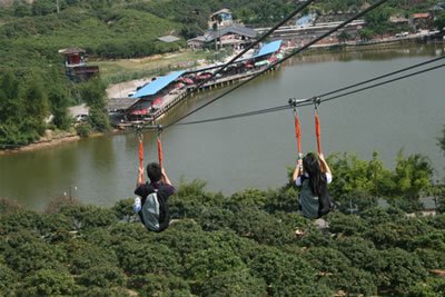 空中飛人滑索項(xiàng)目位于觀音廟后,依山勢而建,在果樹山林之間架起了一段全程300米、落差50米,每秒7.5米滑行速度的高空索道,在歷時40秒滑行時間中,游客在享受高空索道帶來驚險刺激體驗(yàn)同時,可一覽園區(qū)秀美風(fēng)景并,讓人回味無窮。