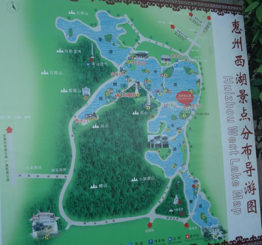 惠州西湖面積遼闊,湖岸彎環(huán)曲折,湖上洲嶼點(diǎn)綴、三面青山環(huán)抱。湖泊東西最寬處達(dá)4公里,南北最長(zhǎng)達(dá)6公里,面積最大時(shí)有10平方公里,湖區(qū)面積約80平方公里。在煙波浩淼的湖面上,堤橋如帶,把湖面分割成五大部分,素有“五湖六橋”之稱。北宋大文學(xué)家蘇東坡贊惠州“山水秀邃”。這里是廣東著名的5A級(jí)國(guó)家風(fēng)景名勝區(qū)和旅游勝地。