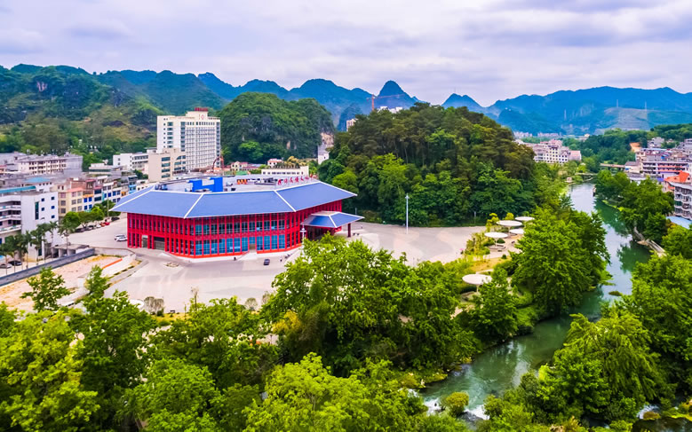 德保芳山文化體育公園范圍包括原九曲橋公園及芳山,位于縣城東部中心城區(qū),由鑒河景觀廊道串連而成,其間有山地、河流等各種豐富的自然景觀。公園總占地面積16.99公頃,其中綠化面積15.69公頃,水體面積3.361公頃,景區(qū)內(nèi)旅游資源豐富,這里空地清新,有蜿蜒清澈的河流、郁郁蔥蔥的草木,宛如世外桃源;這里歌圩之風(fēng)盛行,民族風(fēng)情濃郁,節(jié)慶活動(dòng)豐富多彩,是一個(gè)集濱河觀光、文化體驗(yàn)、休閑度假、健身娛樂(lè)、生態(tài)科普于一體的多功能旅游景區(qū)。